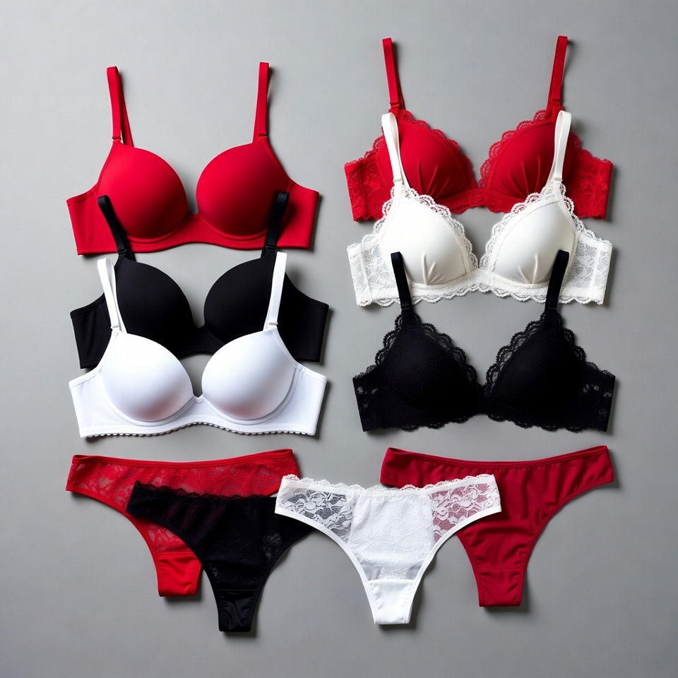 apparel, black bra, black lingerie, bras, clothing, fashion, flat lay, intimates, isolated background, lace bra, lace panties, lingerie set, panties, push-up bra, red bra, red lingerie, sexy lingerie, thongs, underwear, white bra, white lingerie, women's underwear, lingerie