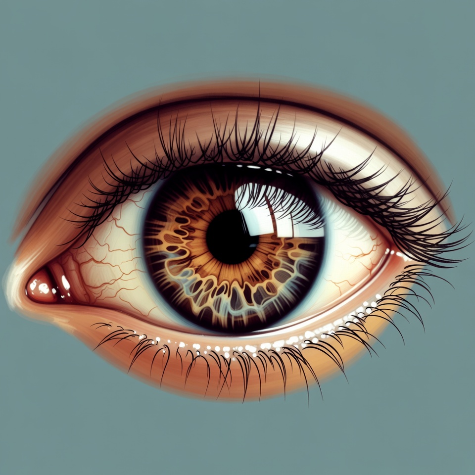A close-up digital illustration of a human eye with a striking hazel iris featuring brown and green hues. Long dark eyelashes frame the eye, and subtle veins are visible on the white sclera. The eye is set against a plain teal background.