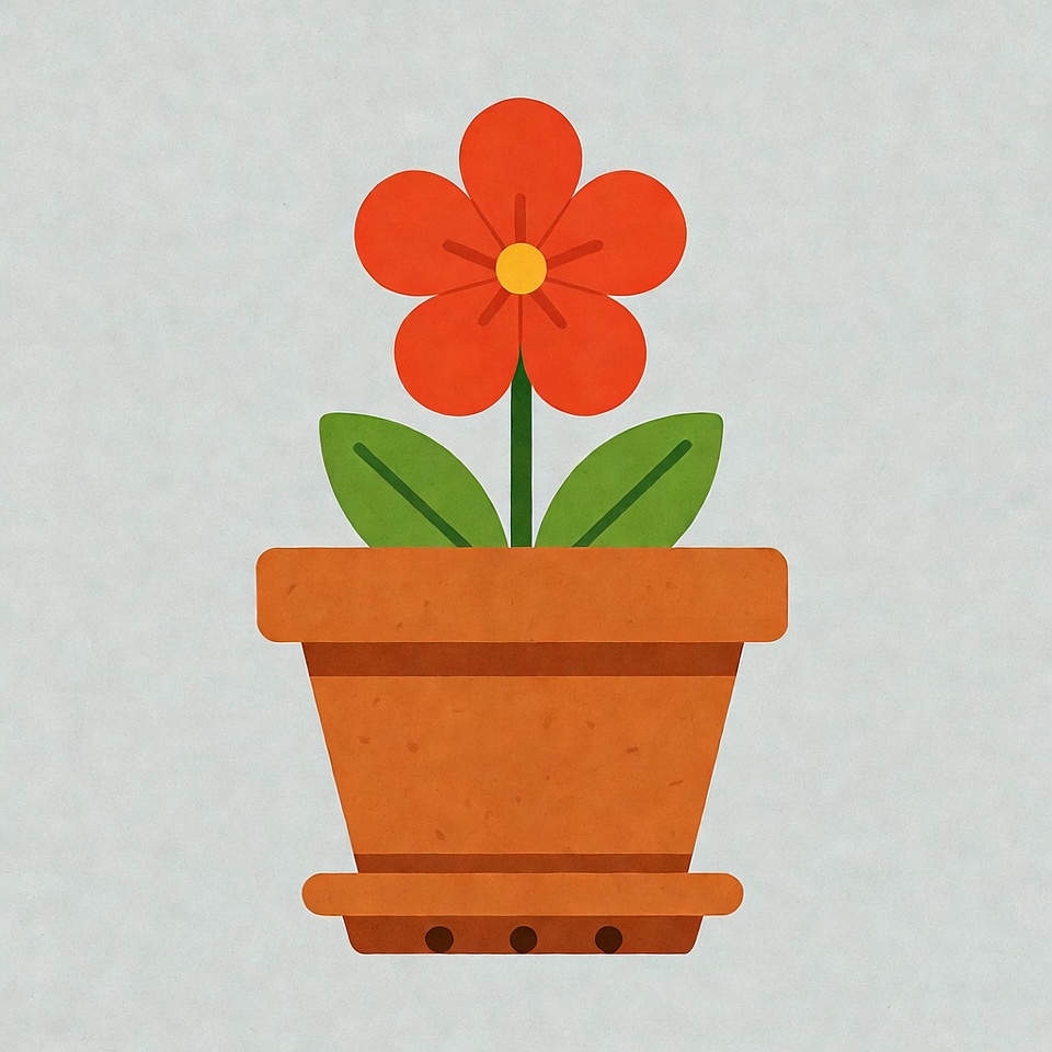 A vibrant red flower with five petals and a yellow center grows from green leaves in a terracotta pot. The pot features a textured orange-brown surface and sits on a matching saucer. The illustration is set against a light gray background.