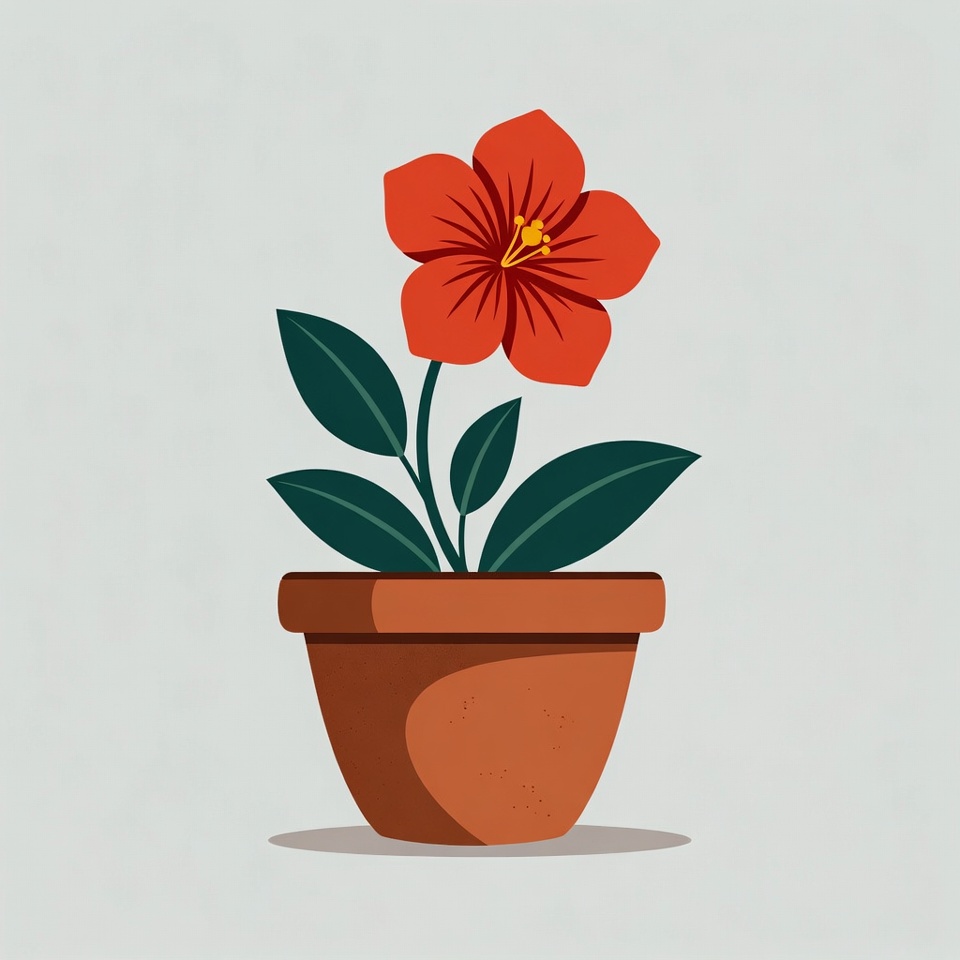 A vibrant red flower with yellow center and green leaves grows from a terracotta pot. The illustration features clean lines on a light gray background. The flower petals are layered and detailed simply.