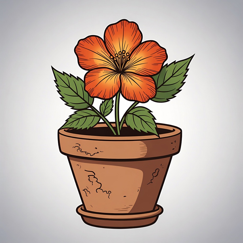 blooming flower, clipart, floral, flower illustration, flower pot, green leaves, hibiscus, illustration, isolated background, line art, orange flower, plant, potted plant, terracotta pot, hibiscus flower