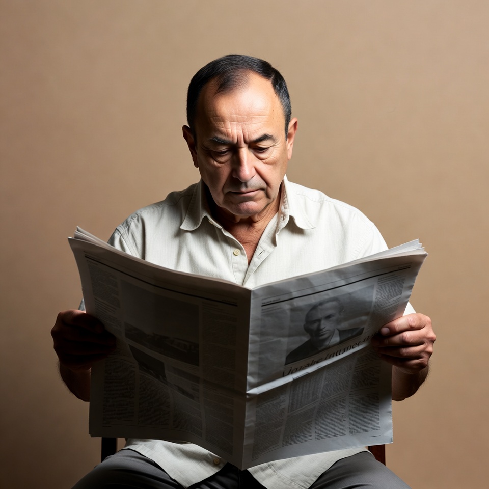An older man with short dark hair sits on a wooden chair holding a large open newspaper. He wears a light-colored short-sleeve button-up shirt and gray pants. The image features a plain beige background with soft lighting.