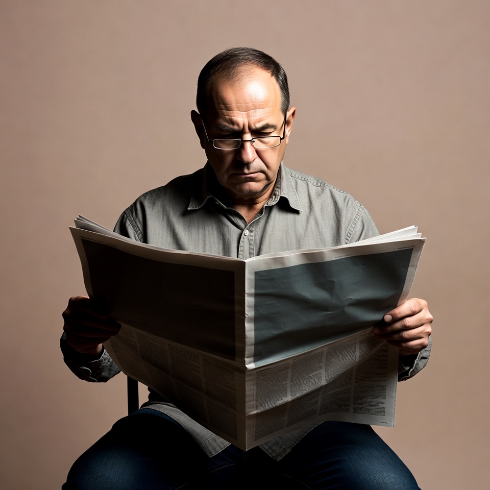 A middle-aged man with short dark hair and glasses sits on a chair reading a large open newspaper. He wears a light gray button-up shirt and dark pants, holding the paper with both hands. The image features a plain beige background.
