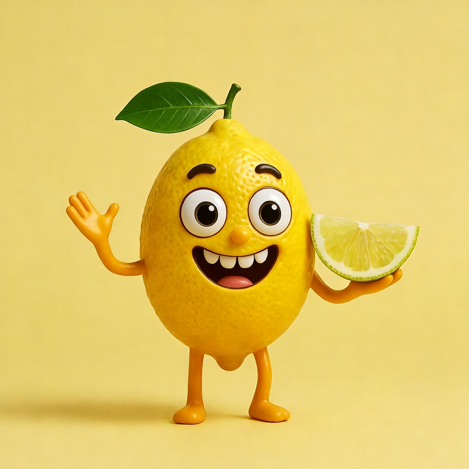 A cheerful cartoon lemon character with big eyes and a wide smile waves one arm while holding a lemon slice in the other. It has green leaves on top and orange legs, standing on a solid yellow background. The illustration features a glossy yellow texture and playful expression.