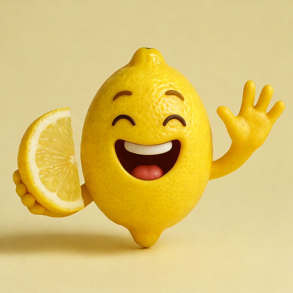 3D illustration, anthropomorphic lemon, cartoon lemon, cute character, emoji style, food illustration, fruit character, glossy texture, happy face, isolated background, lemon slice, smiling lemon, waving lemon, yellow fruit, lemon