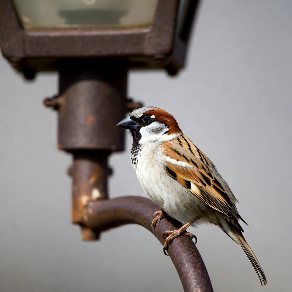 avian, bird, birdwatching, brown bird, feathers, house sparrow, isolated background, metal pole, nature, outdoor, perched, rusty lamp, small bird, street lamp, vintage lamp, wildlife, sparrow