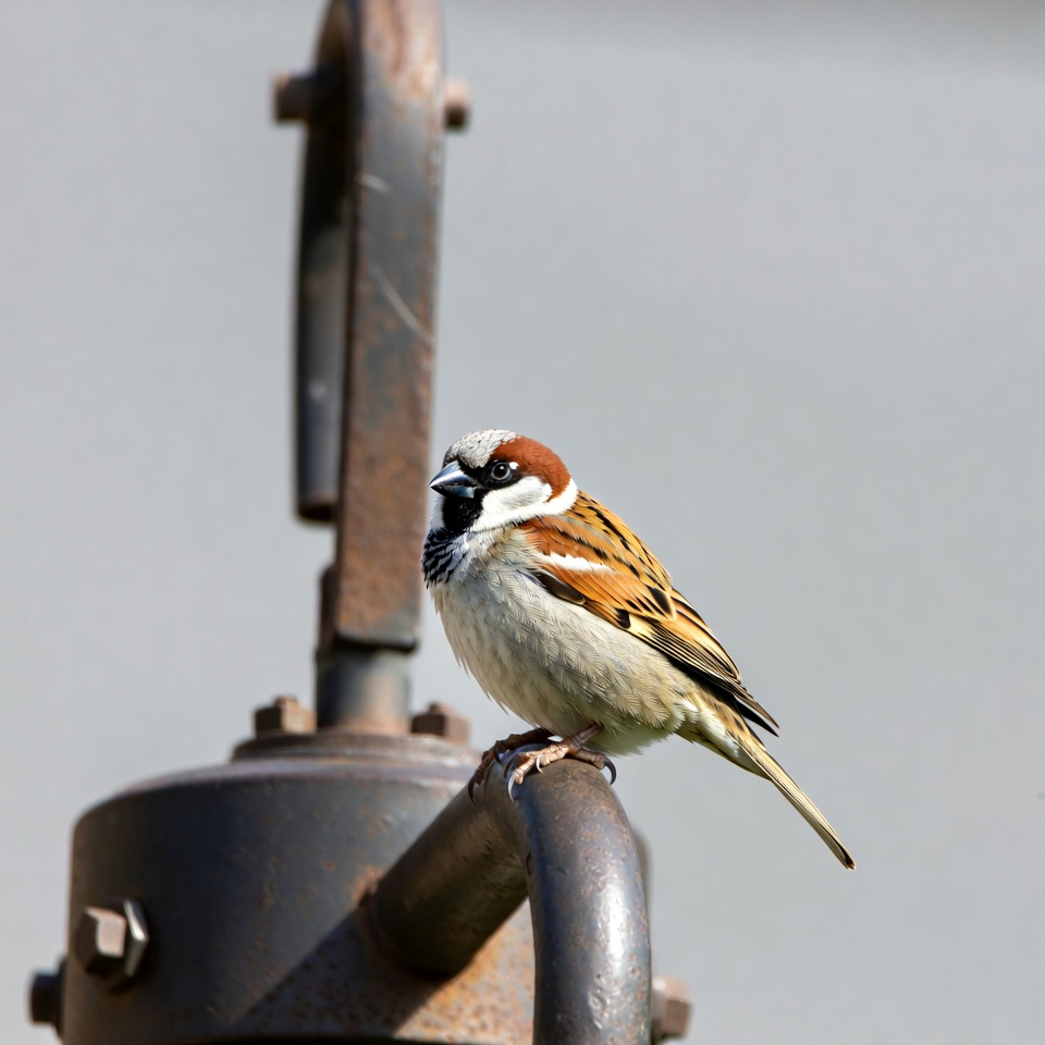 avian, bird, black beak, brown bird, feathers, isolated background, metal pipe, nature, perched, rusty pipe, small bird, sparrow, white cheek, wildlife, house sparrow