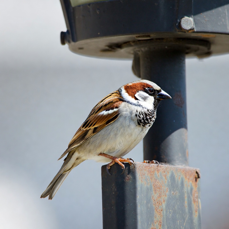 avian, bird, black bib, brown bird, feathers, isolated background, metal pole, nature, outdoor, perched, pole, rusty pole, small bird, sparrow, street lamp, white cheeks, wildlife, house sparrow