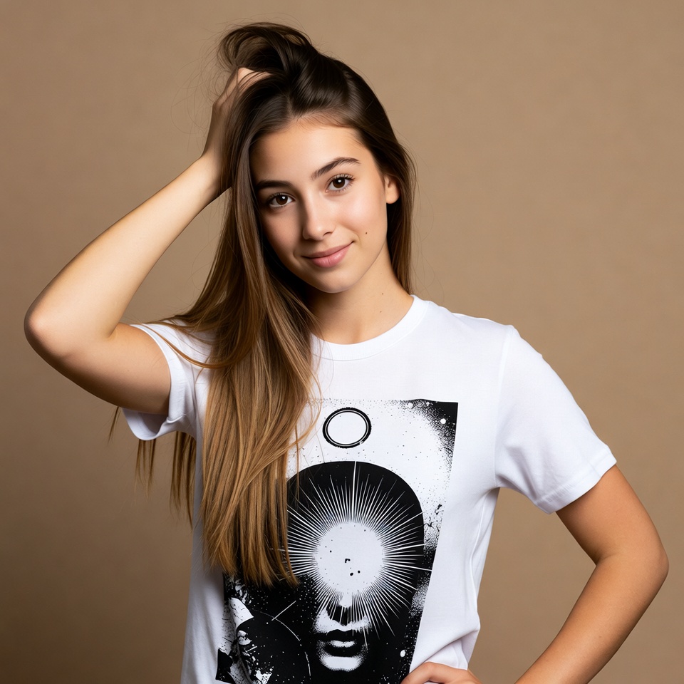 A young woman with long brown hair stands against a beige background, smiling softly at the camera. She wears a white t-shirt featuring a graphic print of a face with radiant sunburst eyes and a circular design. Her right hand is positioned in her hair, and she poses confidently with her left hand on her hip.