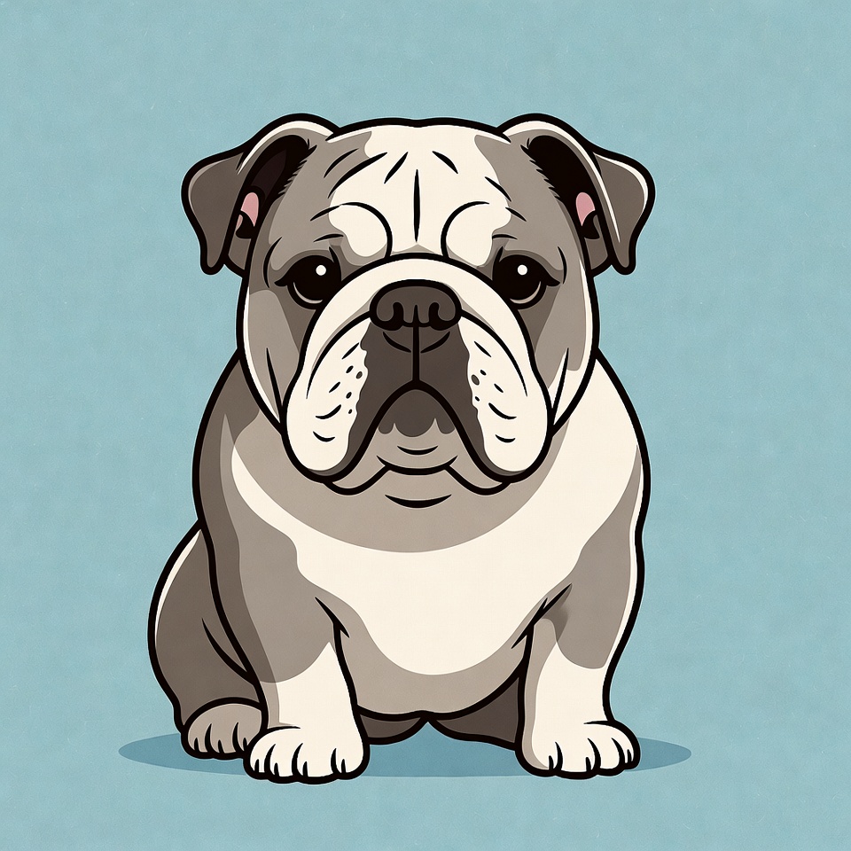 A cute cartoon bulldog with a white face, brown ears, and expressive eyes sits on a light blue background. The illustration features detailed wrinkles on its forehead and muzzle, chubby body, and white paws. It faces forward with a friendly expression.