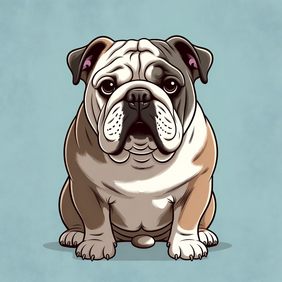A cartoon bulldog with a white and brown coat sits facing forward on a light blue background. The dog has large expressive eyes, wrinkled face, and floppy ears. It is rendered in a detailed vector illustration style.