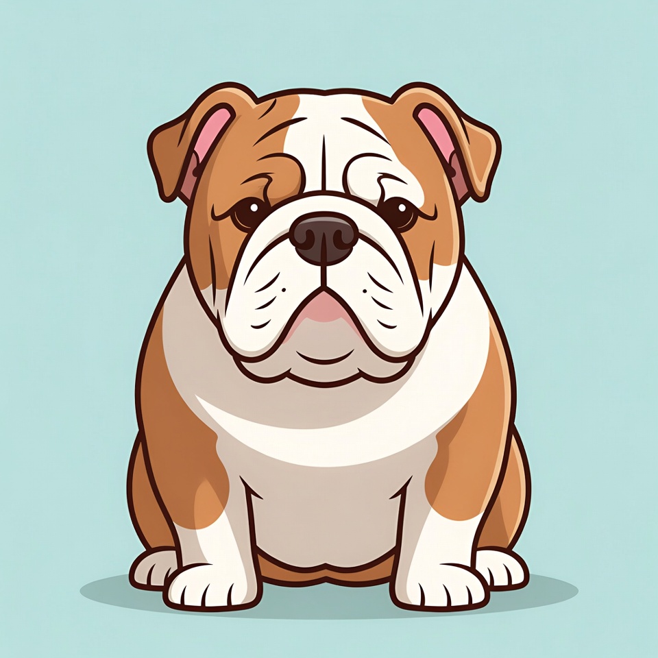 A cute cartoon bulldog with brown and white fur sits on a light blue background. The illustration features expressive eyes, wrinkled face, floppy ears, and a stocky body. It has a friendly expression with paws visible in front.