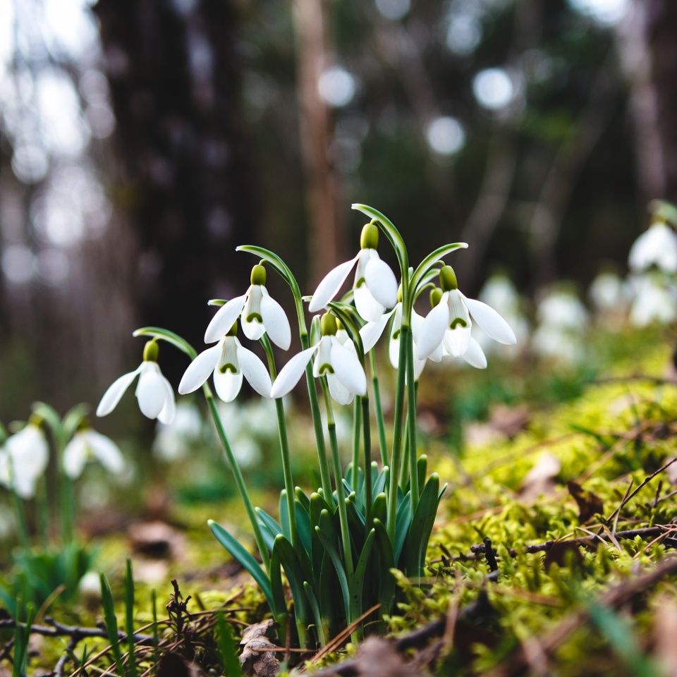 blooming flowers, early spring, flora, flower cluster, forest floor, forest plants, green stems, macro photography, moss, natural habitat, nature, outdoor, petals, plants, snowdrop flowers, spring flowers, white flowers, wildflowers, woodland, snowdrops
