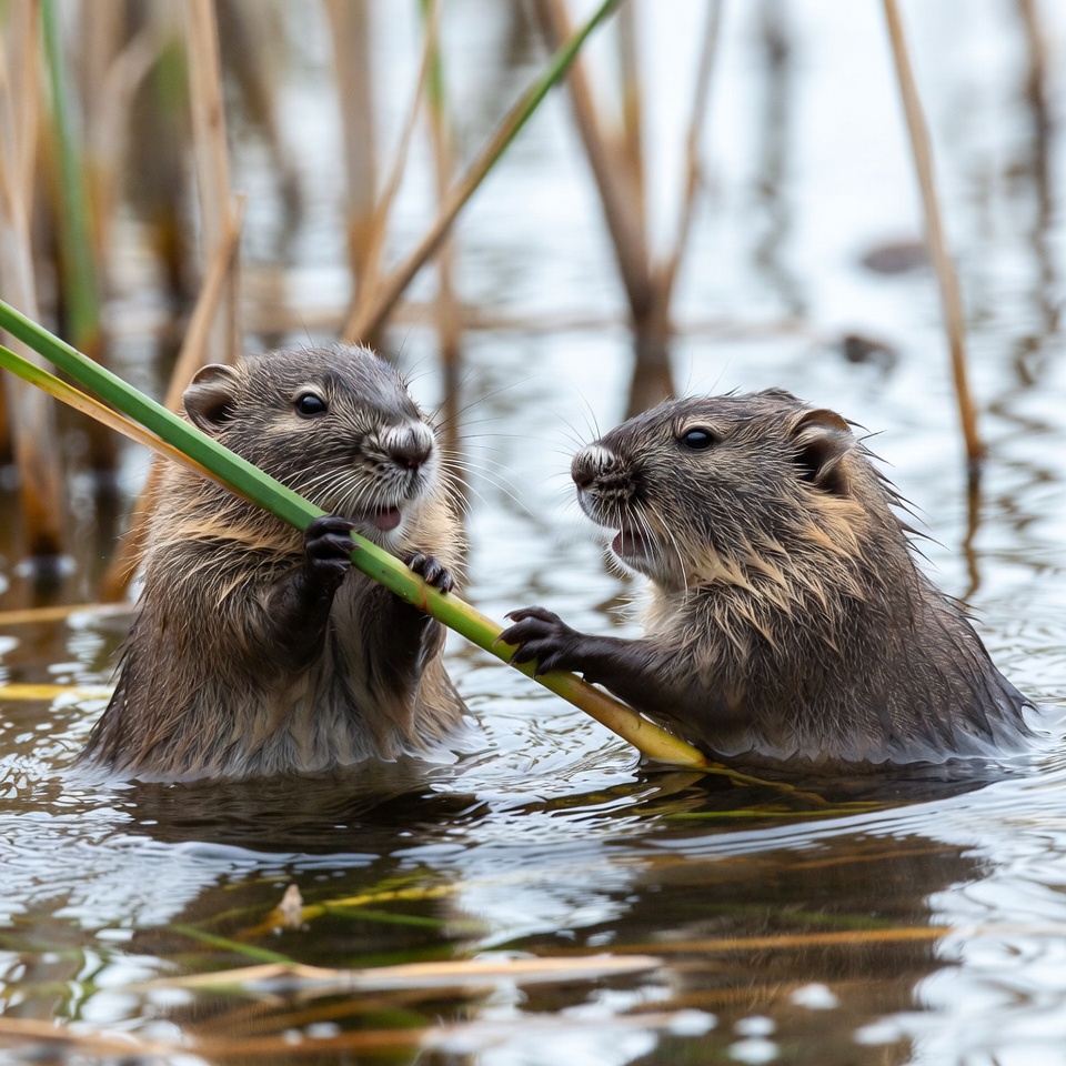 animal play, animals, baby muskrats, brown fur, cattails, cute animals, marsh, nature, paws, playing, playing with reed, reed, rodents, shallow water, two muskrats, water, wet fur, wetland, wildlife, muskrats