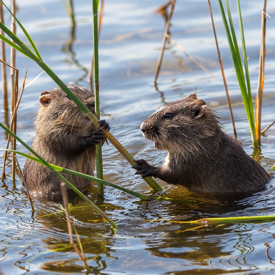 Two nutria playing with reeds