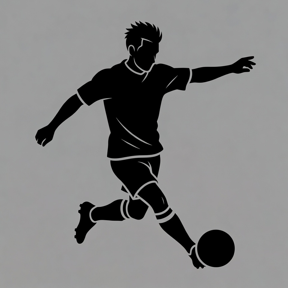 action pose, athlete silhouette, black silhouette, cleats, clipart, dynamic kick, football player, isolated background, kicking ball, male, man, silhouette, soccer ball, soccer jersey, soccer kick, soccer shorts, sports graphic, sports illustration, vector art, soccer player