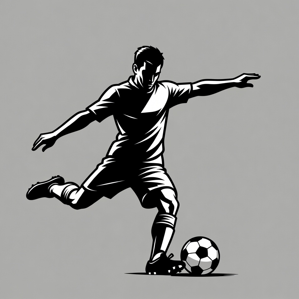 action, athlete, black white, cleats, dynamic, football, illustration, isolated background, jersey, kick, kicking ball, male, man, player kicking, shorts, silhouette, soccer ball, sport, sports, vector, soccer player