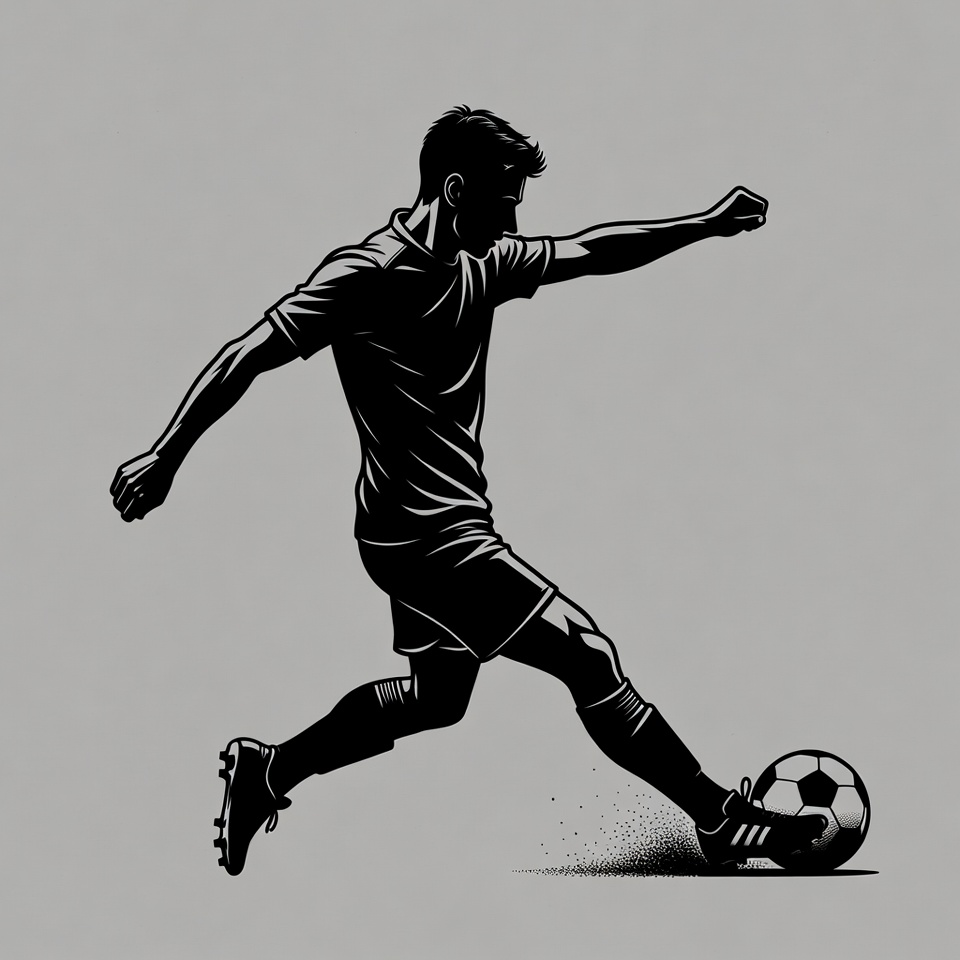 A silhouette illustration of a male soccer player in mid-action kicking a soccer ball. He wears a jersey, shorts, and cleats, with dynamic motion lines and dust effects at his foot. The image is rendered in black against a gray background.
