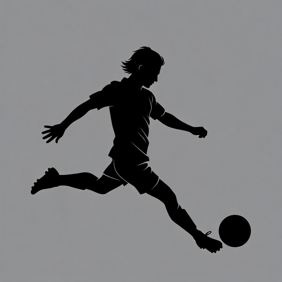 athlete, black silhouette, cleats, clipart, dynamic pose, football player, illustration, isolated background, jersey, jumping, kicking, kicking ball, long hair, player silhouette, shorts, silhouette, soccer ball, soccer kick, sports, sports illustration, vector, soccer player