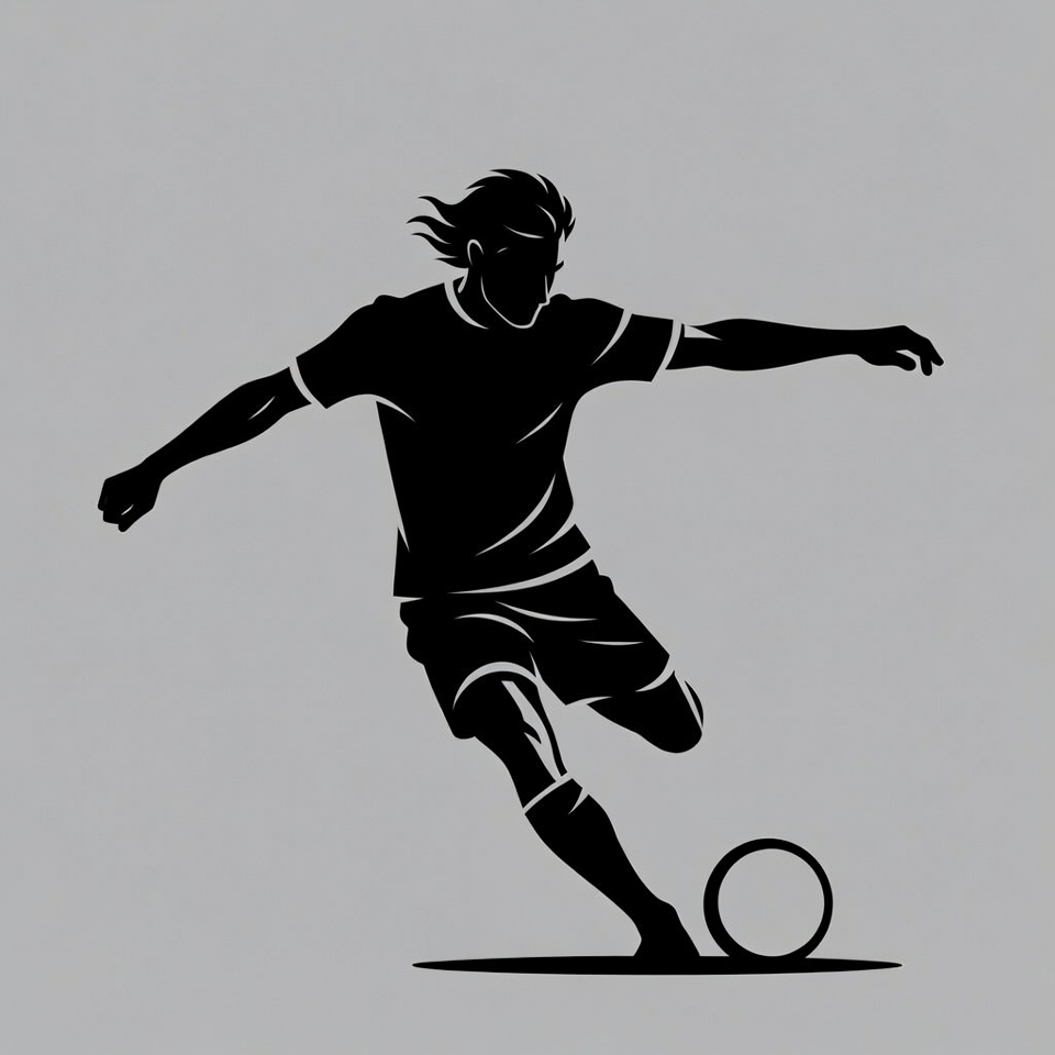 action, athlete, black silhouette, dynamic pose, football, gray background, illustration, isolated background, jersey, kicking ball, kicking soccer, long hair, male, player silhouette, shorts, silhouette, soccer ball, sports, sports illustration, vector art, soccer player