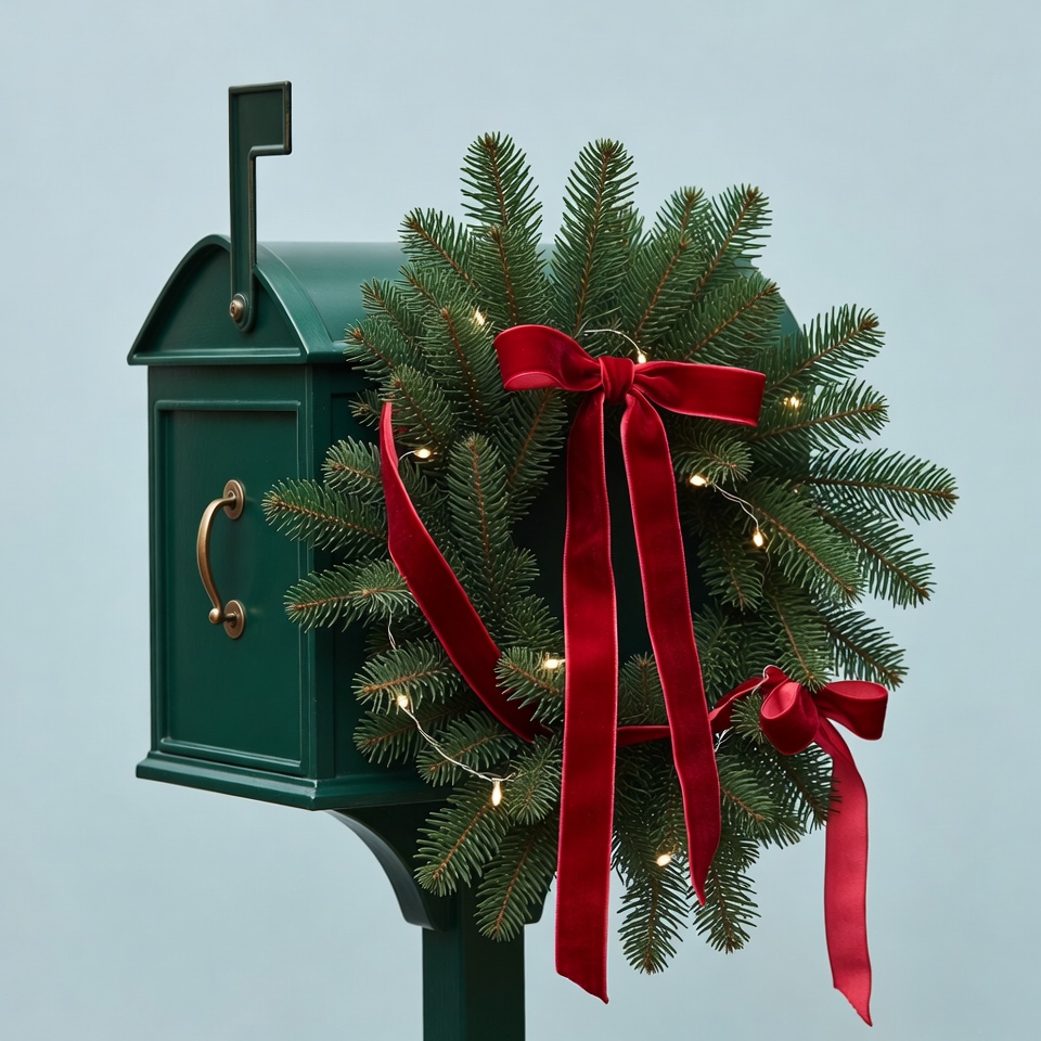 A green metal mailbox stands on a post with a large evergreen wreath decorated with red velvet ribbons and white lights wrapped around it. The wreath features fir branches and is tied with multiple red bows. The mailbox is set against a plain light blue background.