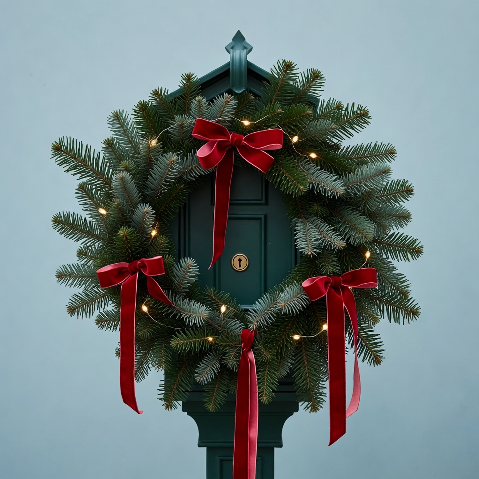 A green vintage-style mailbox stands against a light blue background, adorned with a lush evergreen Christmas wreath. The wreath features dense fir branches, red satin bows in multiple places, and twinkling white lights. A small gold keyhole is visible on the mailbox door.