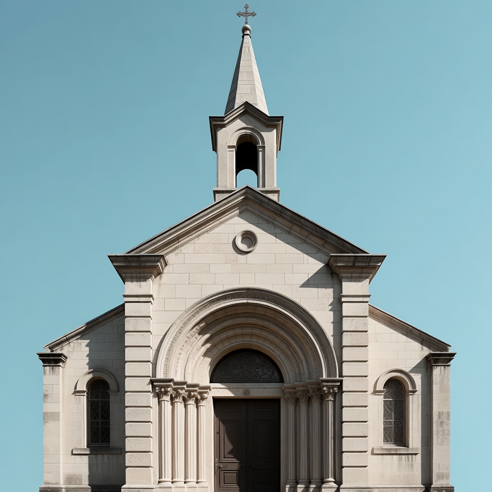 arched door, architecture, blue sky, chapel, christian, columns, cross, facade, gothic, isolated background, religion, religious building, stained glass, steeple, stone building, white stone, windows, church