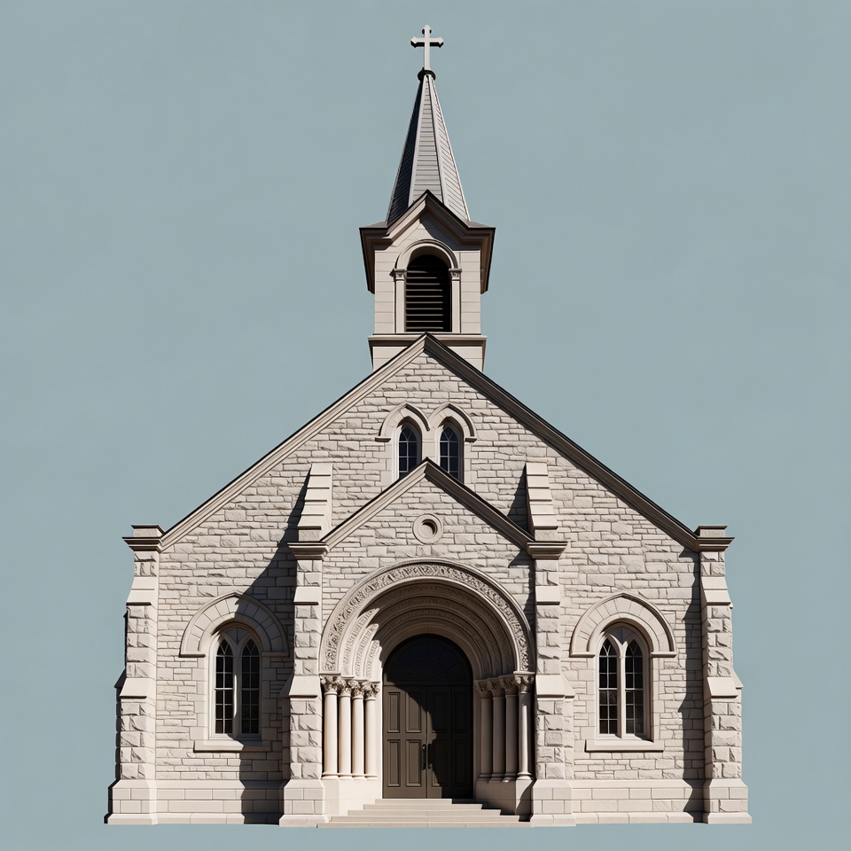 A detailed 3D rendered stone church features a tall pointed steeple topped with a cross. The facade includes arched windows, a large central wooden door, and ornate stonework on a light blue isolated background. Gothic architectural elements are prominent on the symmetrical building.