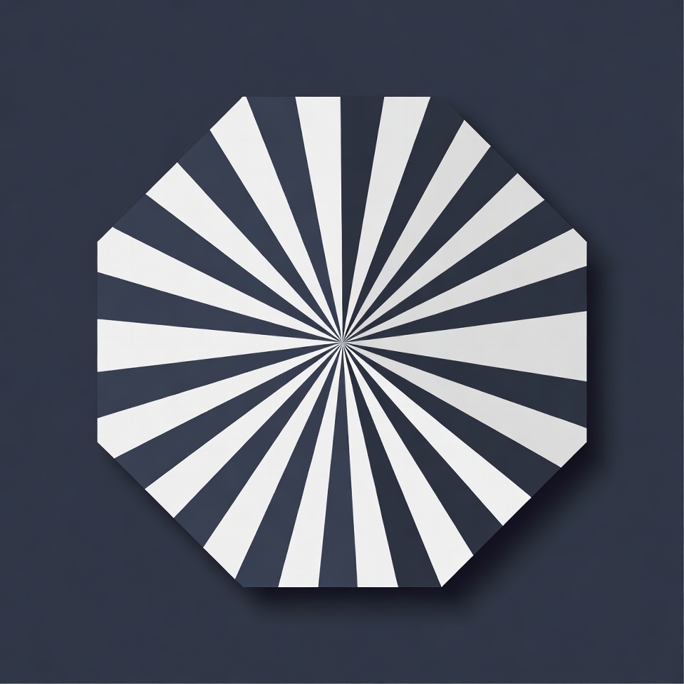 A digital illustration features a black octagon with radiating white lines converging at the center. The design is symmetrical and set against a dark navy background. The sharp lines create a dynamic starburst effect within the geometric shape.