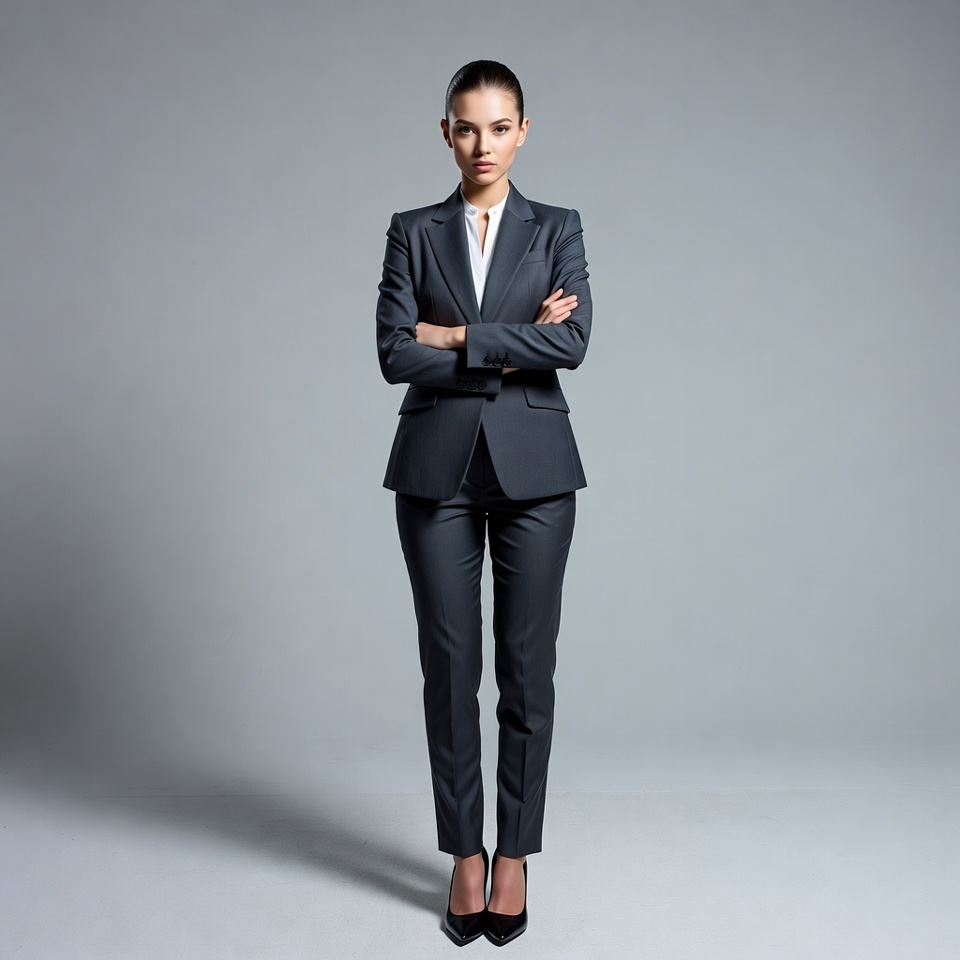A young woman with dark hair in a bun stands confidently with arms crossed against a gray background. She wears a tailored gray business suit with a white blouse and black high heels. Her expression is serious and professional.