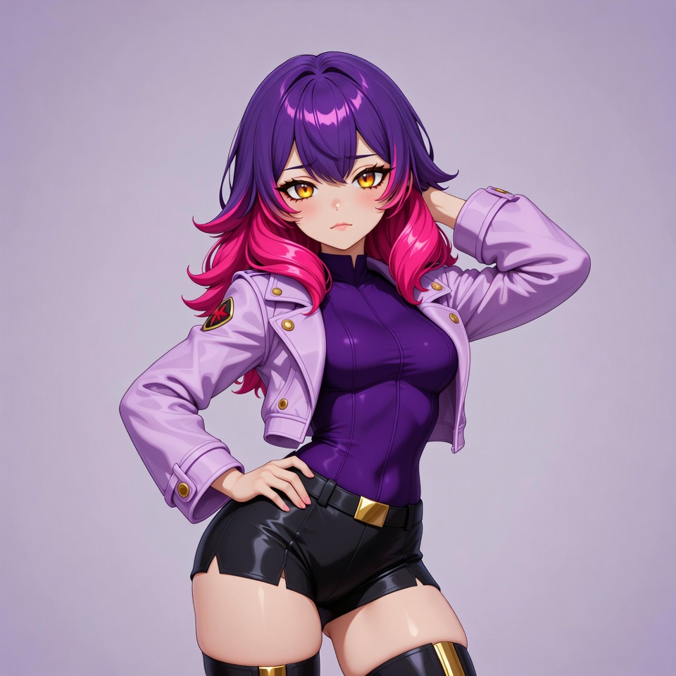 anime character, black shorts, confident pose, cropped jacket, digital art, female, flushed cheeks, gold trim, hand on hip, illustration, isolated background, leather jacket, pink hair, purple bodysuit, purple hair, stylish outfit, thigh-high boots, vibrant colors, wavy hair, yellow eyes, anime girl