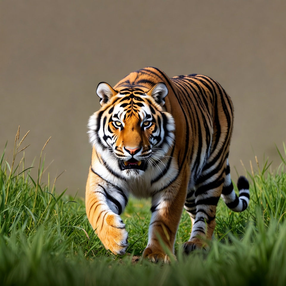 Bengal tiger, animal portrait, big cat, black stripes, fierce tiger, green grass, isolated background, nature, orange fur, outdoors, paws, predator, snarling tiger, striped fur, tall grass, walking tiger, whiskers, wild tiger, wildlife, yellow eyes, tiger