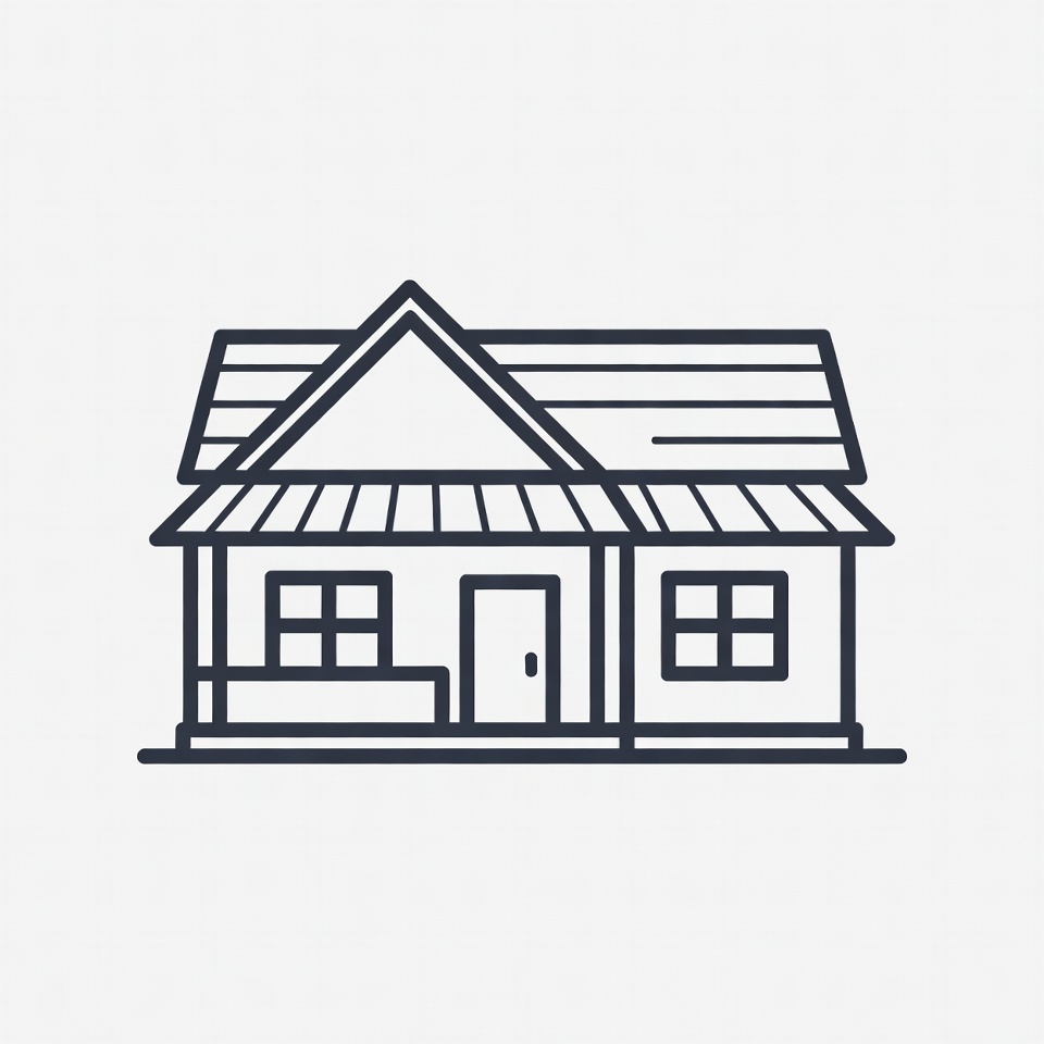 A simple line drawing depicts a house with a gabled roof and covered porch. It features two windows, a central door, and a railing on the porch. The illustration is rendered in thick black outlines on a white background.