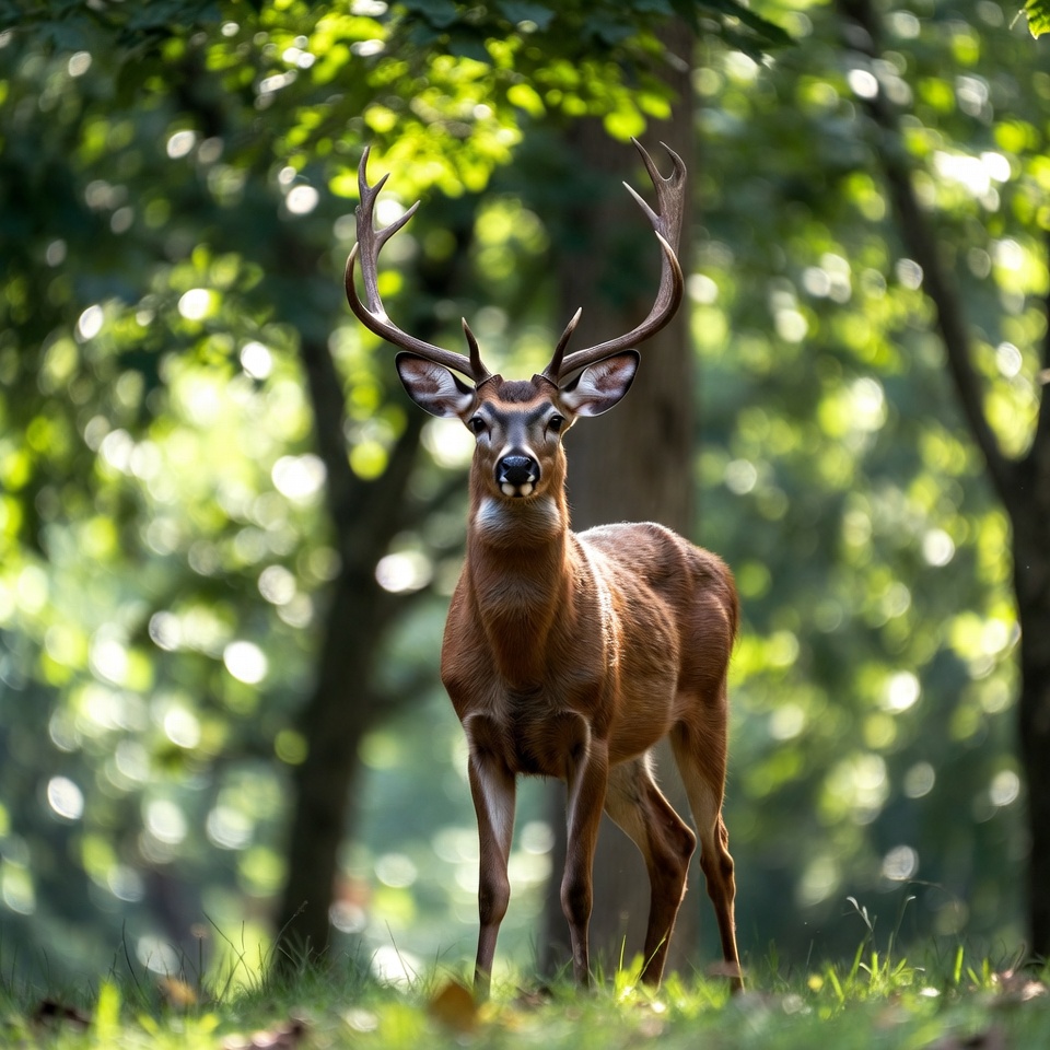 A majestic buck deer with large branching antlers stands alert in a lush green forest. Its reddish-brown coat gleams under dappled sunlight filtering through the dense tree canopy. The deer faces forward on a forest floor covered with grass and leaves.