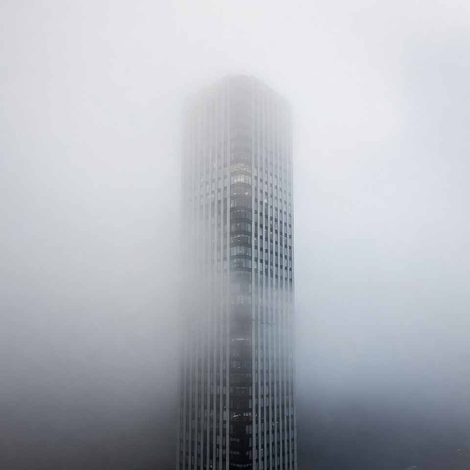 atmosphere, cityscape, cloudy, dense fog, fog, foggy weather, glass windows, hazy, high-rise, mist, modern architecture, obscured building, tall building, urban, vertical, skyscraper