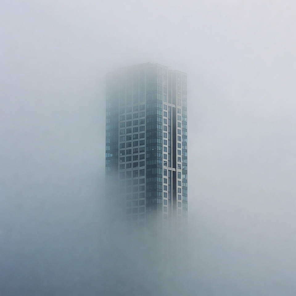 architecture, atmosphere, building, cityscape, cloudy, dense fog, fog, foggy, glass windows, heavy mist, high-rise, mist, modern architecture, obscured, silhouette, tall building, urban, vertical, weather, skyscraper