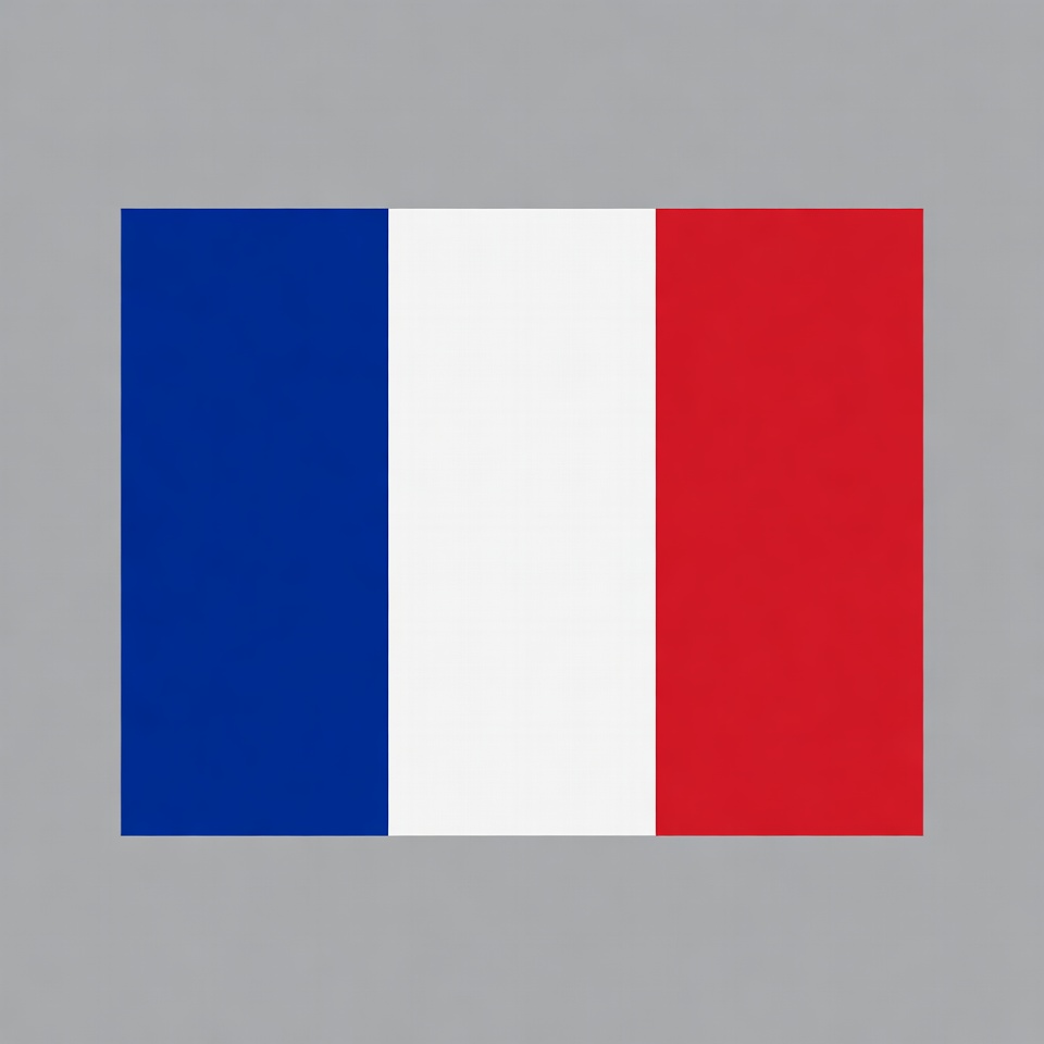 The French national flag features vertical stripes of blue, white, and red. It is centered on a solid gray background with ample space around it. The flag has a simple, bold design with equal-width bands.