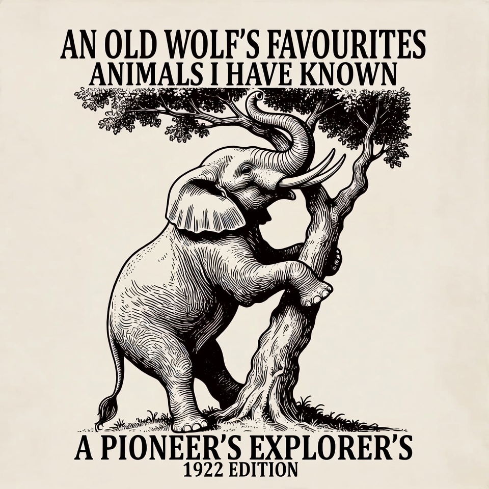 1922 edition, animals, animals known, beige background, black ink, branches, classic illustration, engraving, explorer, favourites, illustration, leaning elephant, line art, old wolf, pioneer, tree, tree trunk, vintage, wildlife art, elephant
