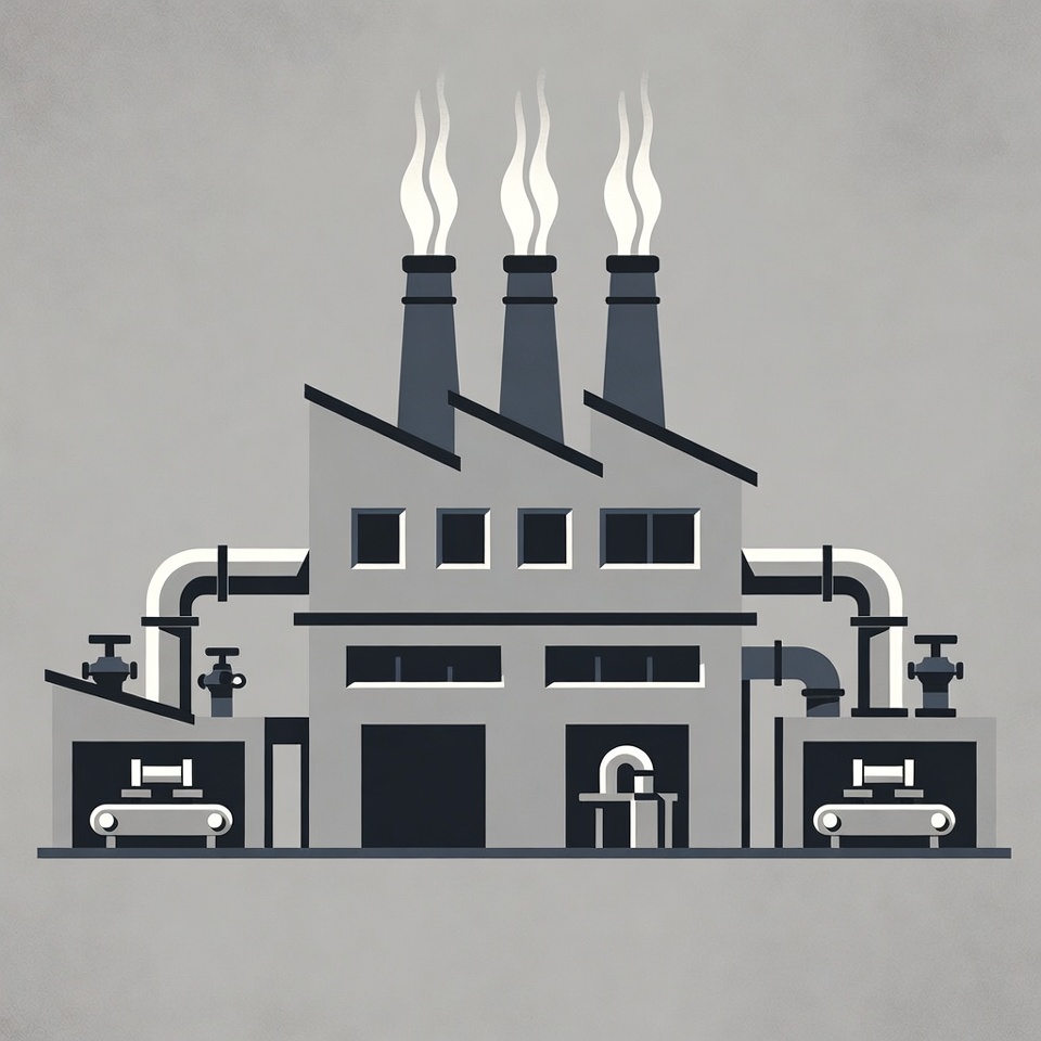 A flat illustration of a large gray industrial factory building features three tall smokestacks emitting white smoke. Pipes, valves, conveyor belts, and garage doors are visible on the structure. The factory is centered on a light gray background.