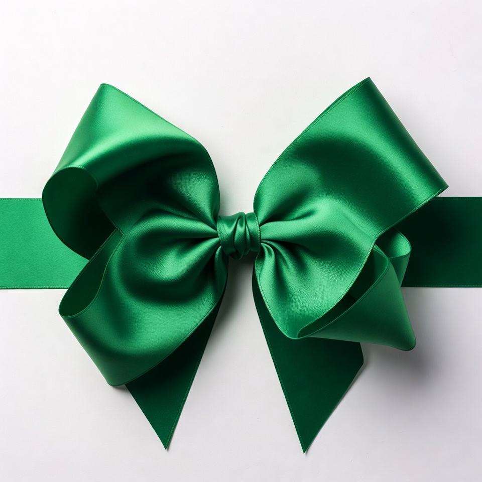 A large green satin ribbon bow is tied neatly and centered on a plain white background. The bow features shiny, flowing loops and tails that drape downward. The vibrant emerald green color contrasts sharply with the white surface.