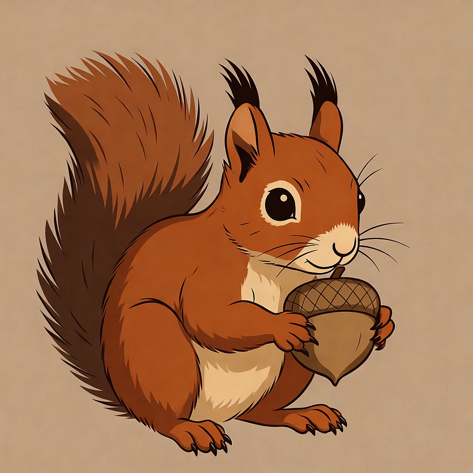 A cute cartoon squirrel with large eyes and fluffy tail holds an acorn in its paws. The squirrel features reddish-brown fur, white belly, and tufted ears on a plain beige background. It sits playfully with the acorn close to its smiling face.