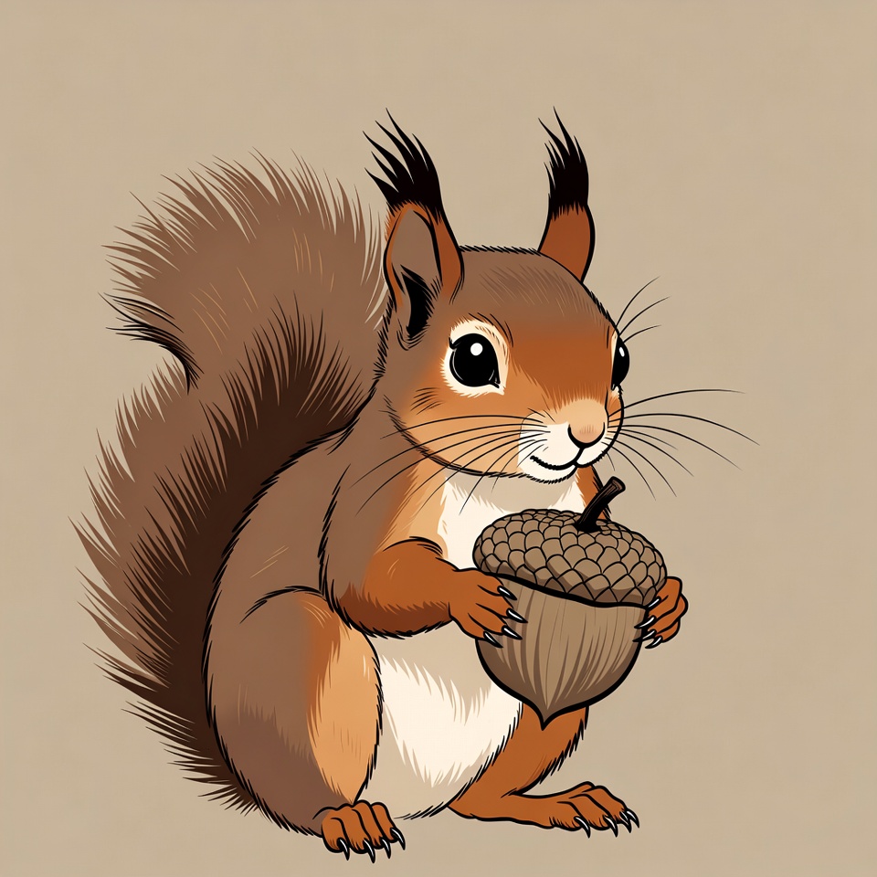 A cute cartoon squirrel with big eyes and fluffy tail holds a large acorn in its paws. The squirrel has reddish-brown fur, white belly, and stands on a plain beige background. Its expression is cheerful with a slight smile.