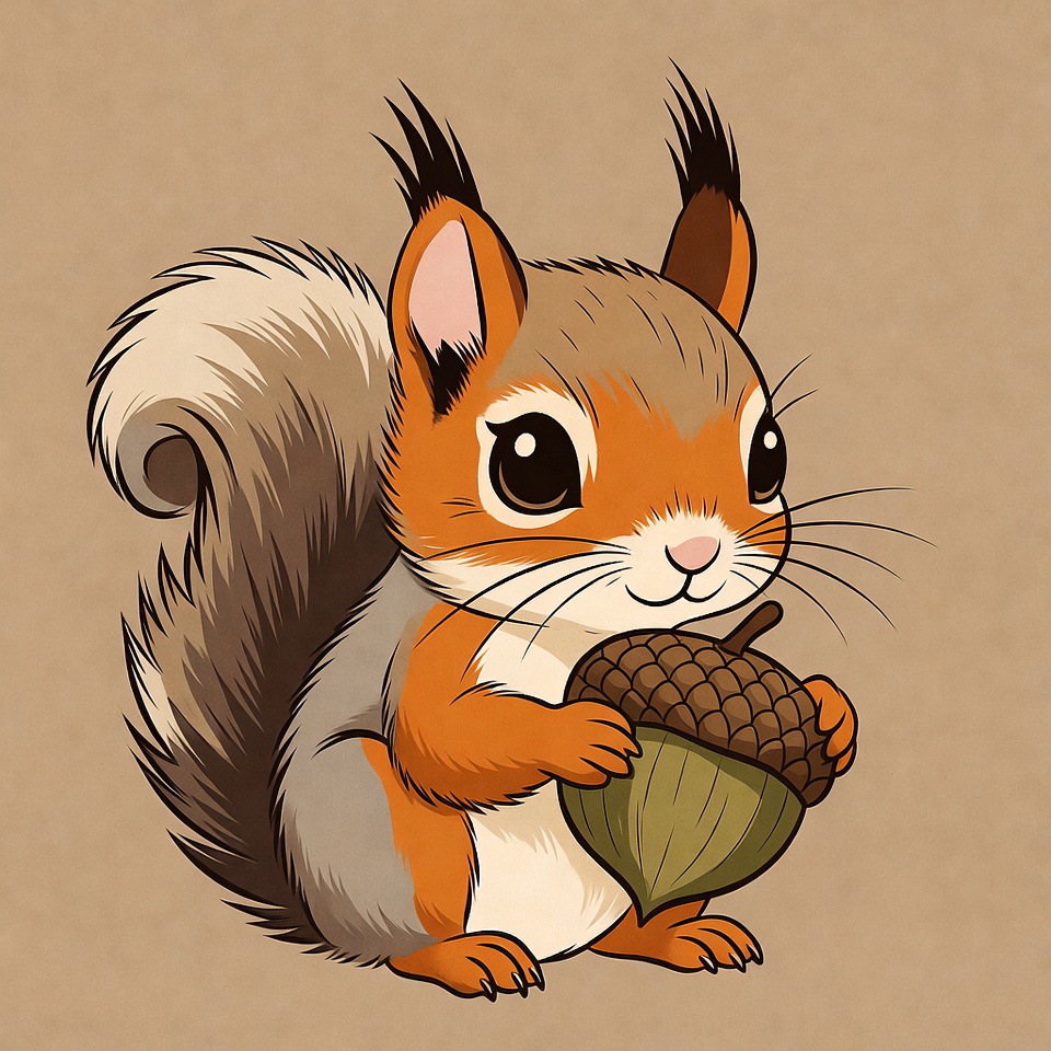 A cute cartoon squirrel with orange fur, white belly, and fluffy tail holds a large acorn in its paws. The squirrel has big expressive eyes, perky ears, and a smiling mouth. It sits on a plain beige background in a kawaii illustration style.