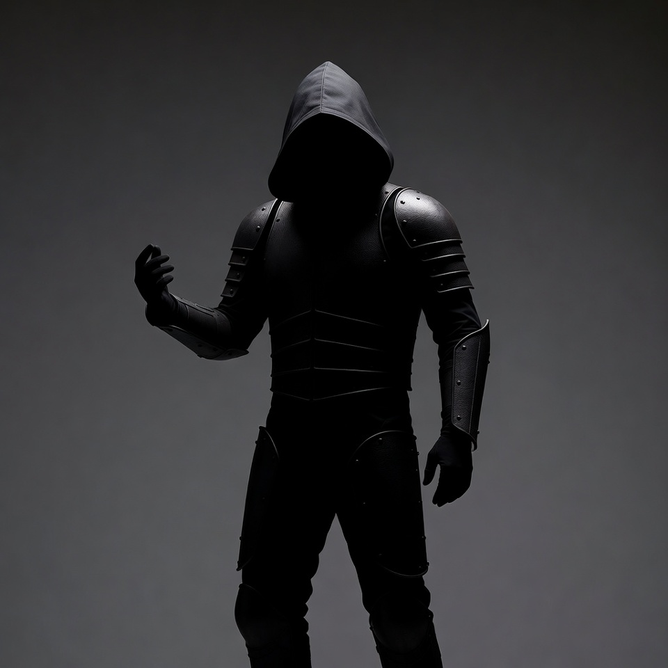 black armor, cloak, dark background, dramatic lighting, fighter, gauntlets, greaves, hood, isolated background, male, man, medieval knight, pauldrons, plate armor, shadow figure, silhouette, warrior, hooded man