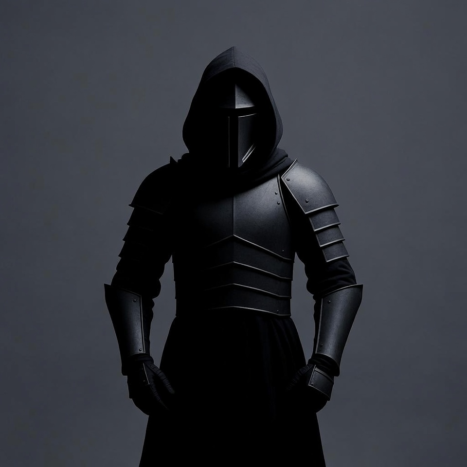 A man stands in full black hooded knight armor with a helmet covering his face. He wears layered plate armor on his chest and arms, paired with dark gloves and a flowing robe. The figure poses confidently against a dark gray background.