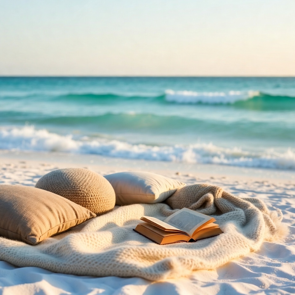 An open book rests on a cozy white blanket surrounded by beige and cream pillows on a sandy beach. Gentle turquoise waves lap at the shore under a bright sky with a hint of sunset. The serene setup invites relaxation by the sea.