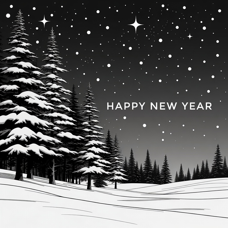 A digital illustration features a snowy forest of pine trees under a starry night sky. Snow-covered hills stretch into the distance, with bold white text reading 'Happy New Year' centered in the foreground. The scene uses black, white, and gray tones for a festive winter greeting.