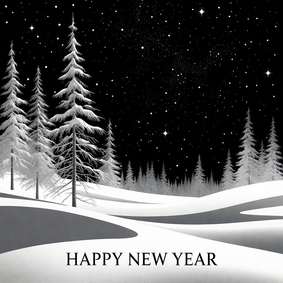 A snowy landscape features clusters of tall pine trees under a starry night sky. Gentle snow-covered hills roll across the foreground. Bold 'Happy New Year' text overlays the center.