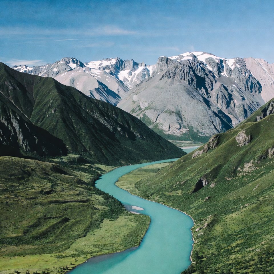 A turquoise river winds through lush green valleys surrounded by rugged, snow-capped mountains. The landscape features steep green slopes and rocky peaks under a clear blue sky. The vibrant water contrasts with the surrounding greenery and distant glaciers.