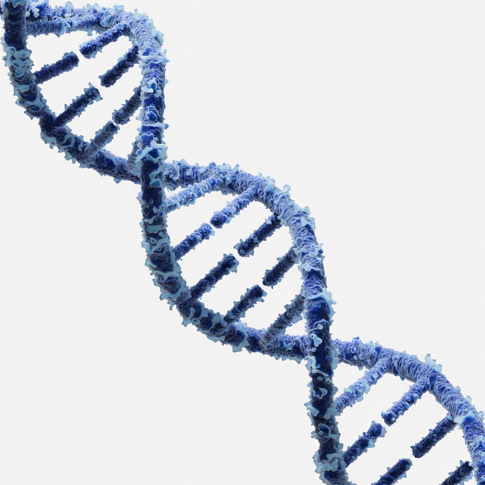 A detailed blue DNA double helix structure twists against a white background. The molecule features fuzzy, ribbon-like strands forming the classic double spiral. It is rendered in a 3D illustration style with a slight angle view.
